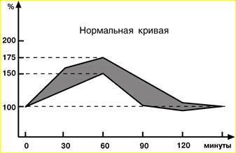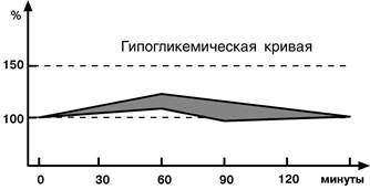 Гипогликемические кривые – повышение концентрации глюкозы не более чем на 25% с быстрым возвращением к исходным значениям. Наблюдаются при аденоме островков Лангерганса, гипотиреозе, гипофункции коры надпочечников, заболеваниях кишечника и дисбактериозе.