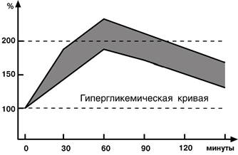 Гипергликемические кривые проявляются повышенным в 2-3 раза уровнем глюкозы крови после нагрузки, что свидетельствует о нарушении гормональных взаимодействий. Нормализация показателей происходит крайне медленно и завершается не ранее 150-180 минут. Наиболее частой причиной таких кривых является скрытый сахарный диабет 1 и 2 типа и повреждении паренхимы печени. Избыток катехоламинов при феохромоцитоме и трийодтиронина при гиперфункции щитовидной железы, гиперкортицизм, заболевания гипоталамуса и гипофиза также проявляются в виде гипергликемической кривой.
