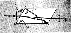 На передней грани призмы естественный луч, параллельный ребру СВ, раздваивается на два луча: обыкновенный (n0 =1,66) и необыкновенный (ne=1,51). Получаем