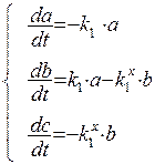 Рассмотрение данного примера так же начнем с установления граничных условий: в момент времени t = 0 a = a0, b = c = 0; в любой момент времени a + b + c = a0.