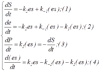 Математическая модель ферментативного катализа была разработана Л.Михаэлисом и М.Ментен в 1913 году и представляет собой решение системы уравнений: