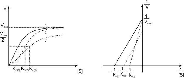 | Рис.2. Графическое отражение зависимости скорости ферментативной реакции (V) от концентрации субстрата (S) в прямых (правый рисунок) и обратных (левый рисунок) координатах. Сплошная линия (1) -исходная кривая; пунктирная (2)-конкурентное ингибирование; штрих-пунктирная (3)-неконкурентное ингибирование. |