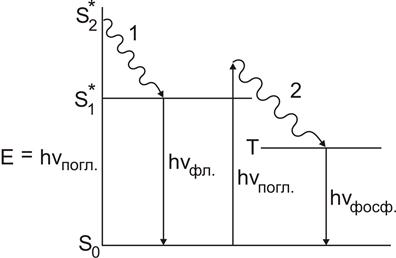 | Рис.3. Образование возбужденныхэнергетических уровней, характеризующихся определенной энергией. 1- синглетного; 2 – триплетного. |