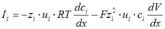 zi –валентность i-го иона, V- потенциал в точке, x – расстояние по толщине мембраны от наружней ее границы. Т.е.плотность ионного тока определяется разностью между диффузионным потоком i-го иона по концентрационному градиенту (1-ое слагаемое) и противоположно направленным потоком этого иона, обусловленным электрическим полем, возникшем при его диффузии (2-ое слагаемое).