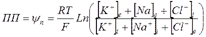 Предполагая, что при потенциале покоя (ПП) суммарный ионный ток равен нулю Ходжкин, Гольдман и Катц вывели уравнение: