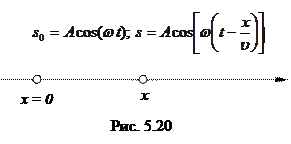 Выведем уравнение плоской волны. Пусть волна распространяется вдоль оси ОХ (рис. 5.20) без затухания так, что амплитуды колебаний всех точек одинаковы и равны А. Зададим колебание точки с координатой х = 0 (источник колебаний) уравнением