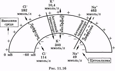 Для большей наглядности рассмотрим схематично ионные потоки, существующие в состоянии покоя на мембране аксона кальмара (рис. 11.16). На рисунке жирными стрелками указаны потоки ионов, осуществляемые за счет активного транспорта. Пунктиром обозначены стрелки, соответствующие диффузионным потокам за счет градиентов концентрации соответствующих ионов. Обозначены также концентрации ионов натрия, калия и хлора в цитоплазме и окружающей среде.