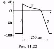 На рис. 11.22 представлен потенциал действия миоцита, где обозначены все фазы возбудимости клетки миокарда. В отличие от нервной клетки, потенциал действия миоцита состоит из очень быстрой фазы деполяризации (1), реполяризации — плато (2) и фазы быстрой реполяризации (3). Длительность потенциала действия составляет для разных клеток миокарда 250— 300 мс. Потенциал действия миоцитов формируется ионными потоками, характер которых не вполне соответствует теории Ходжкина— Хаксли (см. § 11.8). Быстрая деполяризация обусловлена идущими в клетку ионами натрия. Последующее формирование плато потенциала действия связано, в основном, с переносом ионов кальция. В этой фазе работают кальциевые и калиевые каналы. Процесс реполяризации, за счет которого существенно возрастает длительность потенциала действия клеток миокарда, обусловлен двумя причинами. Во-первых, возникает выходящий из клетки поток ионов калия (аналогично нервным клеткам). Во-вторых, уменьшается поток входящих ионов кальция.