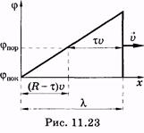Из этой формулы следует, что при сохранении постоянства скорости распространения волны возбуждения u увеличение периода рефрактерности R приводит к возрастанию величины А.. Если в среде есть участки с разной рефрактерностью, то длины волн возбуждения в них различаются. Для большей наглядности волну возбуждения схематически часто изображают в виде двух участков (рис. 11.24), соответствующих фронту волны (участок 1) и рефрактерному «хвосту» (участок 2).