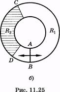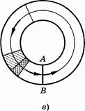 Особенности распространения автоволн в кольце. Одной из причин нарушения ритма сердца может быть образование в миокарде замкнутого пути, по которому циркулирует волна возбуждения. Образование такой волны можно смоделировать в некотором гипотетическом кольце (рис. 11.25). Если кольцо однородно по рефрактерности (рис. 11.25, а), то две волны возбуждения, идущие по кольцу от источника возбуждения (линия АВ), аннигилируют при встрече на линии А'В'. Вторичное возбуждение снова приводит к образованию автоволн, распространяющихся с одинаковой скоростью в противоположных направлениях. Процесс этот повторяется многократно, ритм следования волн возбуждения в кольце не нарушается.
