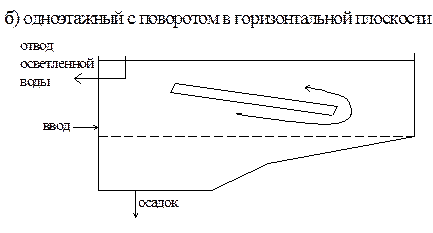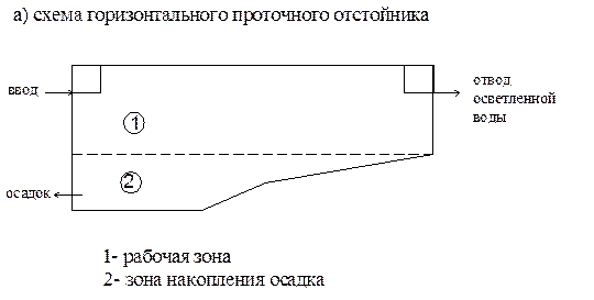 . При любом количестве взвешенных веществ (до 1500 мг/л) применяются отстойники как для осветления некоагулированной взвеси, так и при добавлении реагентов. Зону осветления воды принимают в пределах 3-5 м, а длину отстойника и площади рассчитывают. Основным недостатком данных сооружений является их большая протяжённость. Схематично выглядит следующим образом: