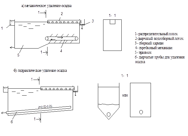 При недопущении перерывов подачи воды на ОС (1 категория-количество отстойников не менее 2). Для равномерного распределения воды по поперечному сечению, предусмотрена система лёгких перегородок, разделяющих горизонтальный отстойник на несколько коридоров, ширина коридора 3-6м. (должно соответствовать шагу колонны). Эти секции отстойника оборудуются водораспределительными устройствами (желоба, водопереливные перегородки) и водосборными устройствами в виде дырчатых желобов различного поперечного сечения. Осадок в отстойниках выпадает неравномерно, и основная его масса находится в передней части отстойника. Для периодического удаления осадка предусматривают уклон днища отстойника в противоположную сторону движения воды. Для цветной воды - уклон 20%, для мутной -30%. Удаление осадка бывает гидравлическим, для этого предусматривают гидроэлеваторы; для плавного сползания осадка к приямку, дно горизонтального отстойника выполняют пирамидальным; угол конусности-45°. В основании пирамиды- дырчатые короба или трубопровод. Расстояние между сборными трубами или коробами должно быть не более 3м при призматическом днище. Если днище горизонтальное, то расстояние не должно превышать 2м. Когда ширина секции отстойника принимается-3м, то количество сборных труб-1, если ширина 6м- 2 трубы.