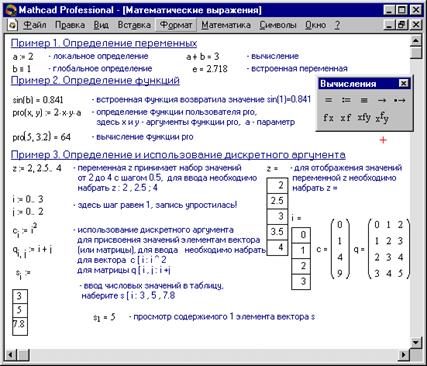 Если переменной присваивается начальное значение с помощью оператора :=, вызывается нажатием клавиши:(двоеточие) на клавиатуре, такое присваивание называется локальным. До этого присваивания переменная не определена и ее нельзя использовать. Однако с помощью знака º (клавиша ~ на клавиатуре) можно обеспечить глобальное присваивание (см. Пример 1 Рисунка 2). MathCAD прочитывает весь документ дважды слева направо и сверху вниз. При первом проходе выполняются все действия, предписанные локальным оператором присваивания (º), а при втором – производятся действия, предписанные локальным оператором присваивания (:=), и отображаются все необходимые результаты вычислений (=).