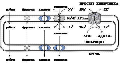 β-Гликозидазный комплекс (лактаза) гликопротеин, гидролизует β-1,4-гликозидные связи в лактозе. Активность лактазы зависит от возраста. У плода она особенно повышена в поздние сроки беременности и сохраняется на высоком уровне до 5-7-летнего возраста. Затем активность лактазы снижается, составляя у взрослых 10% от уровня активности, характерного для детей. Трегалаза гликозидазный комплекс, гидролизует α-1,1-гликозидные связи между глюкозами в трегалозе — дисахариде грибов.Переваривание углеводов заканчивается образованием моносахаридов – в основном глюкозы, меньше образуется фруктозы и галактозы, еще меньше – маннозы, ксилозы и арабинозы. Всасывание углеводов Моносахариды всасываются эпителиальными клетками тощей и подвздошной кишок. Транспорт моносахаридов в клетки слизистой оболочки кишечника может осуществляться путём диффузии (рибоза, ксилоза, арабиноза), облегчённой диффузии с помощью белков переносчиков (фруктоза, галактоза, глюкоза), и путем вторично-активного транспорта (галактоза, глюкоза). Вторично-активный транспорт галактозы и глюкозы из просвета кишечника в энтероцит осуществляется симпортом с Na+. Через белок-переносчик Na+ двигается по градиенту своей концентрации и переносит с собой углеводы против их градиента концентраций. Градиент концентрации Na+ создаётся Nа+/К+-АТФ-азой.
