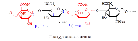 Гиалуроновая кислота построена из повторяющихся дисахаридных фрагментов, каждый из которых в свою очередь состоит из b-D-глюкуроновой кислоты и b-D-N-ацетилглюкозамина.