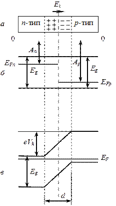 При определенной толщине двойного электрического слоя наступает равновесное состояние контакта, характеризуемое выравниванием уровня Ферми EF для обоих полупроводников (рис.9, в). В области p-n-перехода энергетические зоны искривляются, в результате чего возникают потенциальные барьеры eVк как для электронов, так и для дырок. Толщина d слоя p-n-перехода в полупроводниках составляет 10–6–10–7 м, а контактная разность потенциалов Vк – десятые доли вольт. При обычных температурах носители тока не способны преодолеть потенциальный барьер eV к, поэтому контактный слой является запирающим, т.е. характеризуется повышенным сопротивлением.