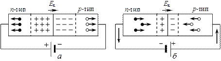 Внешнее электрическое поле изменяет высоту потенциального барьера eVк и нарушает равновесие потоков носителей тока через барьер. Внешнее поле, направление которого совпадает с полем Ек контактного слоя (рис. 10, а), вызывает движение электронов в n-полупроводнике и дырок в p-полупроводнике от границы p-n-перехода в противоположные стороны. В результате запирающий слой расширится и его сопротивление возрастет. Такое направление внешнего поля называют запирающим (обратным). В запирающем направлении электрический ток через p-n-переход практически не проходит.