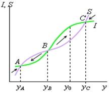 В точке B равновесие неустойчиво, так как при yA < y < yB сбережения превышают инвестиции и на рынке благ образуется избыток, который ведет к сокращению производства.