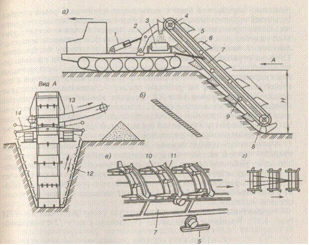 1- два гидроцилиндра и два рычага (2), регулирующие положение рамы, определяющей глубину отрываемой траншеи; 3 – поперечный ленточный конвейер, отбрасывающий грунт; 4- приводной вал цепей; 5- замкнутые пластинчатые цепи; 6 – ковш; 7 – наклонная рама; 8 – натяжные звёздочки рабочего органа; 9- промежуточные ролики; 10 – режущие элементы скребкового типа; 11- транспортирующие заслонки; 12 – активные цепные откосообразователи; 13- балансирный рычаг для крепления цепей откосообразователей.