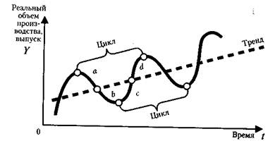 Циклические колебания, носящие периодический характер, следует отличать от тренда — долговременной тенденции экономического развития. Это отличие можно представить графически (рис. 1), где циклические колебания показаны волнообразной сплошной линией, а тренд (позитивный) — прямой пунктирной линией.