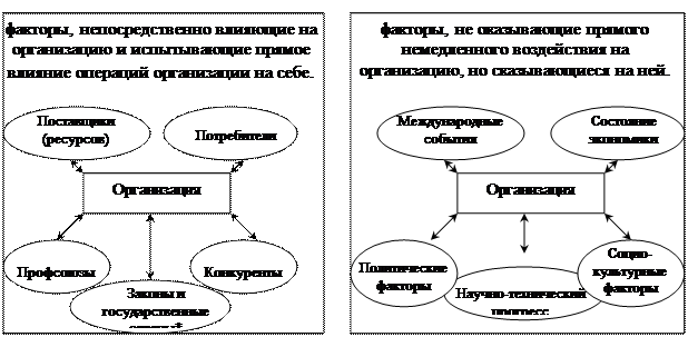 Внешняя среда представляет собой совокупность объектов и условий, складывающихся за пределами организации, с которыми организация взаимодействует непосредственно (среда прямого воздействия или деловое окружение) и которые она должна учитывать (среда косвенного воздействия или фоновое окружение).
