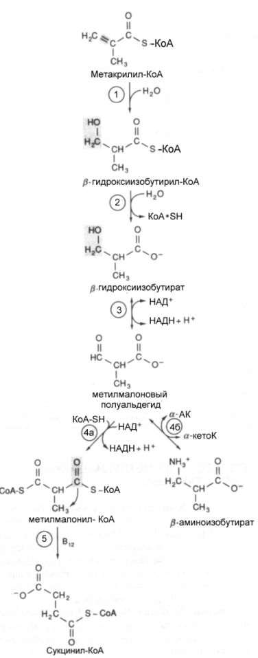 Продукты окислительного декарбоксилирования представляют тиоэфиры КоА и подвергаются окислению путем дегидрирования, напоминающего дегидрирование линейных ацил-КоА тиоэфиров в процессе катаболизма жирных кислот. По-видимому существует несколько дегидрогеназ, катализирующих эту реакцию, о чем свидетельствуют наблюдения, что у больных с нзовалериановой ацидемией, по сле приема обогащенной белком пищи в крови накапливается изовалерат; хотя содержание других разветвленных а-кетокислот не повышается. Изовалериат образуется путем деацилирования изовалерил-КоА, являющегося субстратом упомянутой выше дегидрогеназы.