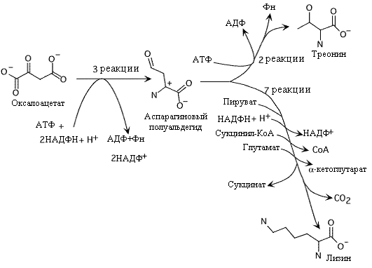 Треонин и лизин - незаменимые у млекопитающих аминокислоты. Они отличаются от остальных аминокислот тем, что при своем распаде они не подвергаются дезаминированию и следовательно не образуют соответствующих кетокислот, из которых их можно было бы получить. У микроорганизмов синтез треонина и лизина начинается преобразованием оксалоацетата в аспарагиновый полуальдегид. Этот путь использует одну молекулу АТФ и две молекулы НАДФH + Н+