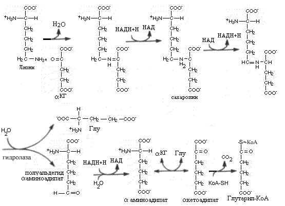 В отличие от большинства аминокислот для которых первой стадией катаболизма является переаминирование ни a-, ни e-аминогруппы L-лизина в этом процессе не участвуют. Катаболизм L-лизина начинается с конденсации лизина с кетоглутаровой кислотой с последующим восстановлением образовавшегося Шиффова основания при участии дегидрогеназы в сахаропин. Сахаропин окисляется другой дегидрогеназой и под влиянием гидролазы распадается на L-глутамат и L-a-аминоадипат-5-полуальдегид.