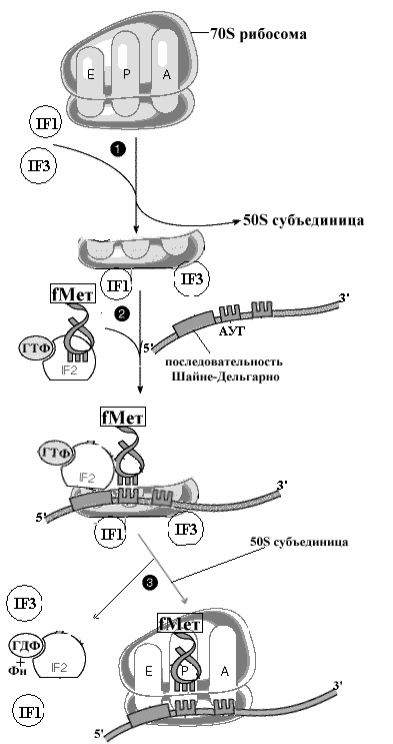 Итак, после завершения описанных выше процессов возникает инициирующий комплекс, в состав которого входит малая рибосомная субъединица, связанная с иРНК. К инициирующему кодону иРНК комплементарно присоединен антикодон инициирующей метионил-тРНК, с последней связан фактор инициации IF2, который несет на себе молекулу ГТФ.