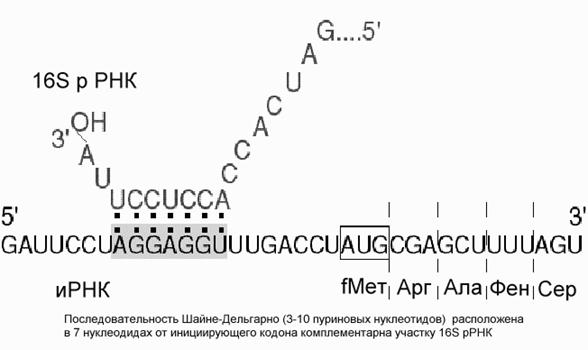 Эта последовательность в большей или меньшей степени комплементарна 3'-концевому участку рибосомной 16S РНК, богатому пиримидиновыми нуклеотидными остатками (5'-GAUCACCUCCUUA-3' у E.coli). Комплементарными могут быть от 3 до 9 остатков (обычно около 4-5). Последовательность CCUCC 3'-концевого участка 16S РНК E.coli оказывается наиболее часто комплементарной (хотя, как правило, частично) полипуриновой прединициирующей последовательности иРНК. Считается, что комплементарное спаривание 3'-концевого участка 16S РНК с прединициирующим полипуриновым блоком иРНК и обеспечивает точную установку инициирующего комплекса на начало кодирующей последовательности иРНК.