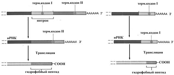 На рис. показаны возможные варианты позитивного (2) и негативного (1) контроля сплайсинга в двух типах клеток. Молекула репрессора тормозит сплайсинг первичного транскрипта РНК в клетке 2, а молекула активатора включает механизм сплайсинга в той же клетке. Это позволяет создавать различные белки с первичных транскриптов одного и того же гена в разных клетках или переключать образование функционально активных и неактивных белков в пределах одной клетки.
