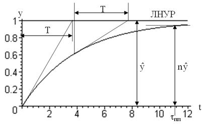 На рис. 3.2 представлена графически зависимость регулируемой величины у во времени, называемая графиком переходного процесса. Здесь ЛНУР – линия нового установившегося режима. Очевидно, что она является асимптотой для кривой - графика переходного процесса. Эта кривая (в математике она имеет специальное название – экспонента) обладает следующим свойством: отрезок, отсекаемый на ЛНУР касательной к экспоненте в какой-либо точке и перпендикуляром из этой точки, численно равен постоянной времени. Тогда можно дать толкование физическому смыслу постоянной времени, если рассмотреть такое построение из начала координат.
