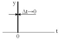 Это тоже в некотором роде идеализация. При скачкообразном сигнале на входе в моменты времени, не равные нулю, сигнал на выходе равен нулю, а в нулевой момент времени выходной сигнал имеет вид импульса, бесконечно большого по величине и бесконечно малого по продолжительности (рис. 3.4)