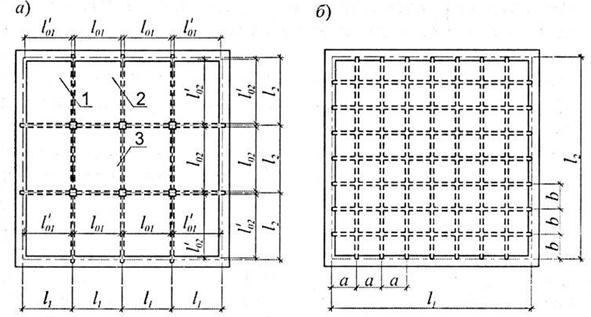 а – с внутренними колоннами (плиты больших пролетов); б – без внутренних колонн (кессонные перекрытия);