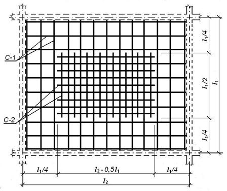 Армируют ПОК обычно сетками. Так как ПОК работают в двух направлениях, то и рабочая арматура ставится в двух направлениях. При пролетах плиты более 2,5 м применяют раздельное армирование самостоятельными сетками в пролете и на опорах (над балками). Нижнюю арматуру (у нижней грани плиты) выполняют из двух сеток с одинаковой площадью сечения рабочей арматуры в каждом направлении. При этом одна сетка доводится до опор, а другая размещается в средней части и не доводится до опор на расстояние