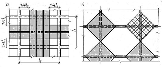 В состав таких перекрытий входят плиты, работающие на изгиб в двух направлениях, и поддерживающие их балки (рис. 1). Все элементы перекрытия монолитно связаны между собой. Экспериментально установлено, что изгиб плит в двух направлениях имеет место при отношении длинной и короткой сторон