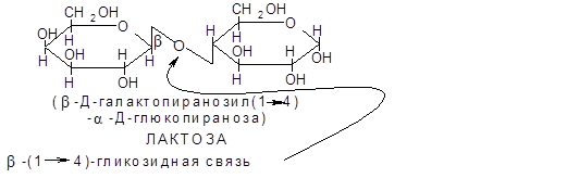 Лактоза – резервный дисахарид (молочный сахар) – содержится в молоке (4-5%) и получается в сыроваренной промышленности из молочной сыворотки после отделения творога. Сбраживается лишь особыми лактозными дрожжами, содержащимися в кефире и кумысе. Лактоза построена из остатков b-Д-галактопиранозы и a-Д-глюкопиранозы, соединенных между собой b-(1→4)-гликозидной связью. Лактоза является восстанавливающим дисахаридом, причем свободный полуацетальный гидроксил принадлежит остатку глюкозы, а кислородный мостик связывает первый углеродный атом остатка галактозы с четвертым атомом углерода остатка глюкозы.