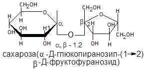 Сахароза состоит из a-Д-глюкопиранозы и b-Д-фруктофуранозы, соединенных a-1®b-2-связью за счет гликозидных гидроксилов: