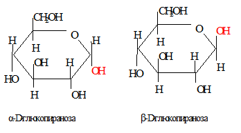 Моносахариды могут иметь незамкнутые и циклические формы (5-членное – фуранозное кольцо, 6-членное – пиранозное кольцо). Образование кольца приводит к появлению асимметрии первого углеродного атома: ОН-группа может быть направлена вверх или вниз по отношению к кольцу (соответственно возникают α и β формы), находящиеся в равновесии с формой открытой цепи.