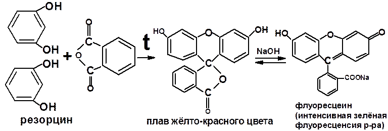 Фенол – синее или фиолетовое; Резорцин – синее;