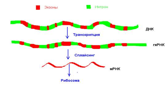 Образовавшаяся РНК содержит не только информативные участки –экзоны, но и неинформативные участки – интроны. Дальнейшие превращения мРНК связаны с ее созреванием - сплайсинг. Процесс сплайсинга в первую очередь связан с вычленением неинформативных участков (интронов). В этом процессе активную роль играют специальные белковые комплексы – «малые ядерные рибополинуклеотидные частицы».