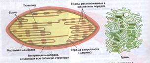 Между складками можно видеть пузырьки – тилакоиды, уложенные в стопку – грану. В каждом хлоропласте около 50 гран, расположенных в шахматном порядке. Такое расположение обеспечивает максимальную освещенность каждой граны. В мембраны, формирующие тилакоиды, встроены пигменты, улавливающие свет, и ферменты, синтезирующие АТФ.