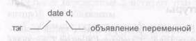 Переменная типа структуры (d) может быть объявлена вне описания структуры при помощи имени структуры, которое иногда называют структурньш тэгом [7], например: