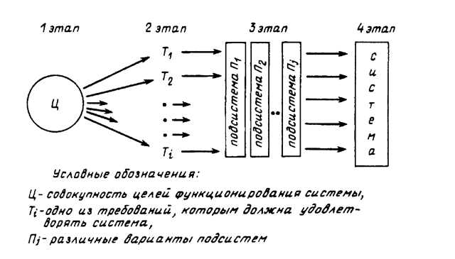 На первом этапе определяются цели функционирования отдельных подсистем. Затем, на втором этапе, анализируется информация, необходимая для формирования отдельных подсистем. И, наконец, на третьем этапе формируются подсистемы, которые в совокупности образуют работоспособную систему.