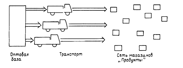 Различные подходы к организации материального потока проиллюстрируем на примере снабжения магазинов бакалейными товарами со складов оптовой базы. Участники этого процесса: оптовая база, транспортное предприятие и сеть обслуживаемых продовольственных магазинов, изображены на рис. 25.
