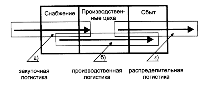Рис. 26. Участки материального потока, на которых преимущественно решаются задачи закупочной, производственной и распределительной логистики
