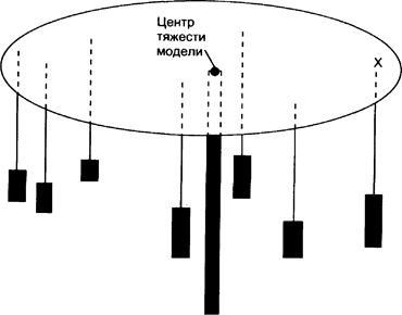 Метод определения центра тяжести (используется для определения места расположения одного распределительного центра). Метод аналогичен определению центра тяжести физического тела. Суть его состоит в следующем. Из легкого листового материала вырезают пластину, контуры которой повторяют границы района обслуживания. На эту пластину в местах расположения потребителей материального потока укрепляют грузы, вес которых пропорционален величине потребляемого в данном пункте потока. Затем модель уравновешивают (рис. 45). Если распределительный центр разместить в точке района, которая соответствует точке центра тяжести изготовленной модели, то транспортные расходы по распределению материального потока на территории района будут минимальны.