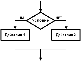 Разветвление (рисунок 11, а) применяется, когда в зависимости от условия нужно выполнять либо одно, либо другое действие. «Действие 1» или «действие 2» может в свою очередь содержать несколько команд.