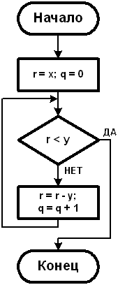 Здесь условие выхода из цикла проверяется до входа в цикл (цикл «Пока») и при x < y, тело цикла не выполняется ни разу, т.е. остается r = x и q = 0.