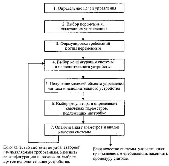 Значительный шаг процедуры синтеза состоит в настройке параметров системы, которые обеспечивали бы желаемые показатели качества. Если в результате подбора параметров мы сможем достигнуть желаемого качества, то на этом процесс синтеза заканчивается и нам остаётся оформить рабочую документацию. В противном случае, возможно, потребуется заменить конфигурацию системы или выбрать исполнительное устройство и датчик с улучшенными характеристиками. После этого мы должны повторять все этапы синтеза до тех пор, пока не будут удовлетворены требования, предъявляемые к системе, или пока мы не решим, что эти требования являются слишком жёсткими и их необходимо ослабить. Процесс синтеза системы управления наглядно изображён на рис.5.23.